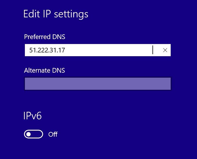 In the next menu scroll down to the IP settings. Enter our IP, 51.222.31.17 into the DNS text box,