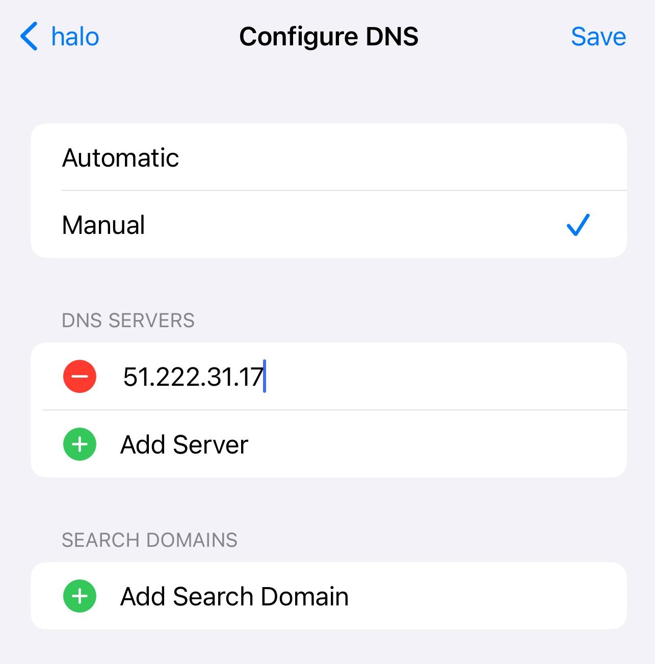 Delete the existing DNS servers. Add our DNS server's IP address 51.222.31.17 Save the settings, reboot your device.